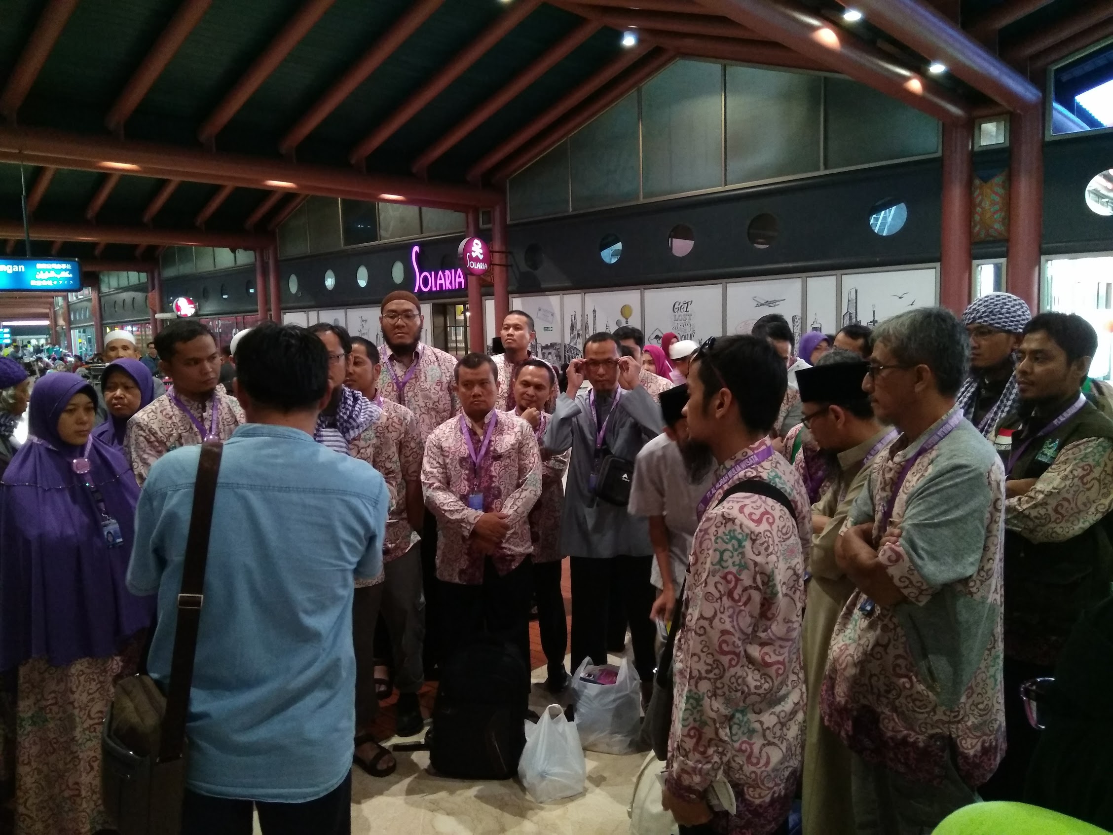 Para jama’ah sedang khusyuk mendengarkan penjelasan untuk persiapan check in menuju tanah haram