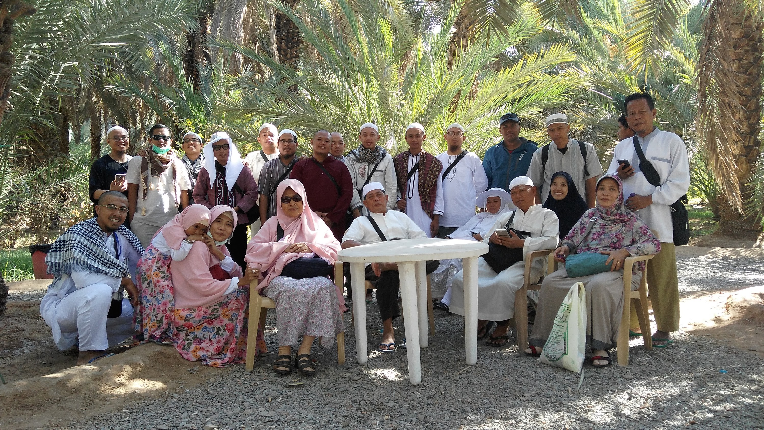Ini adalah para peserta umrah backpacker pada Ramadhan 1437 H. Alhamdulillah ada sekitar 30 peserta yang ikut pada kesempatan ini. Oiya, ini lokasinya di kebun kurma. Jama’ah umrah biasa membeli kurma di kawasan ini.